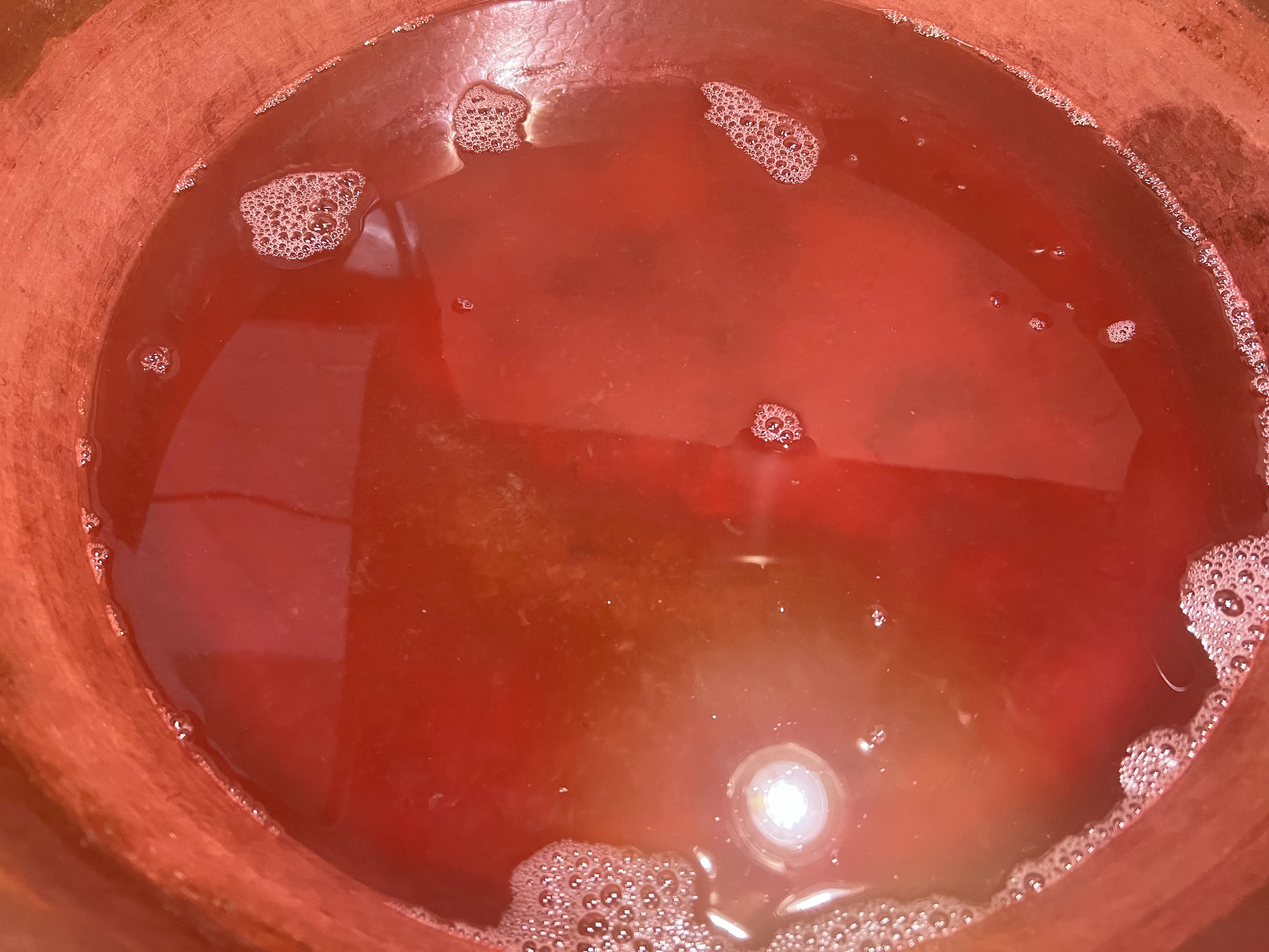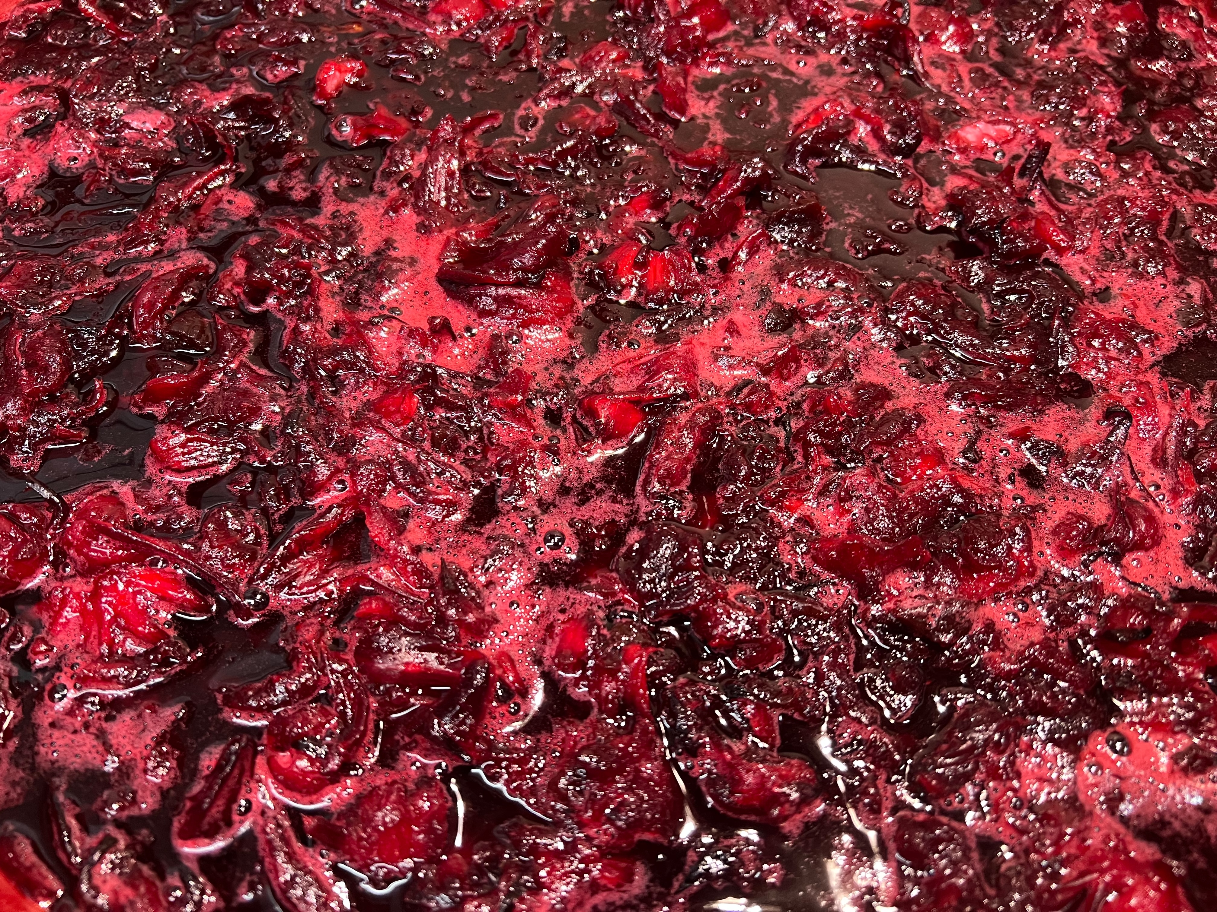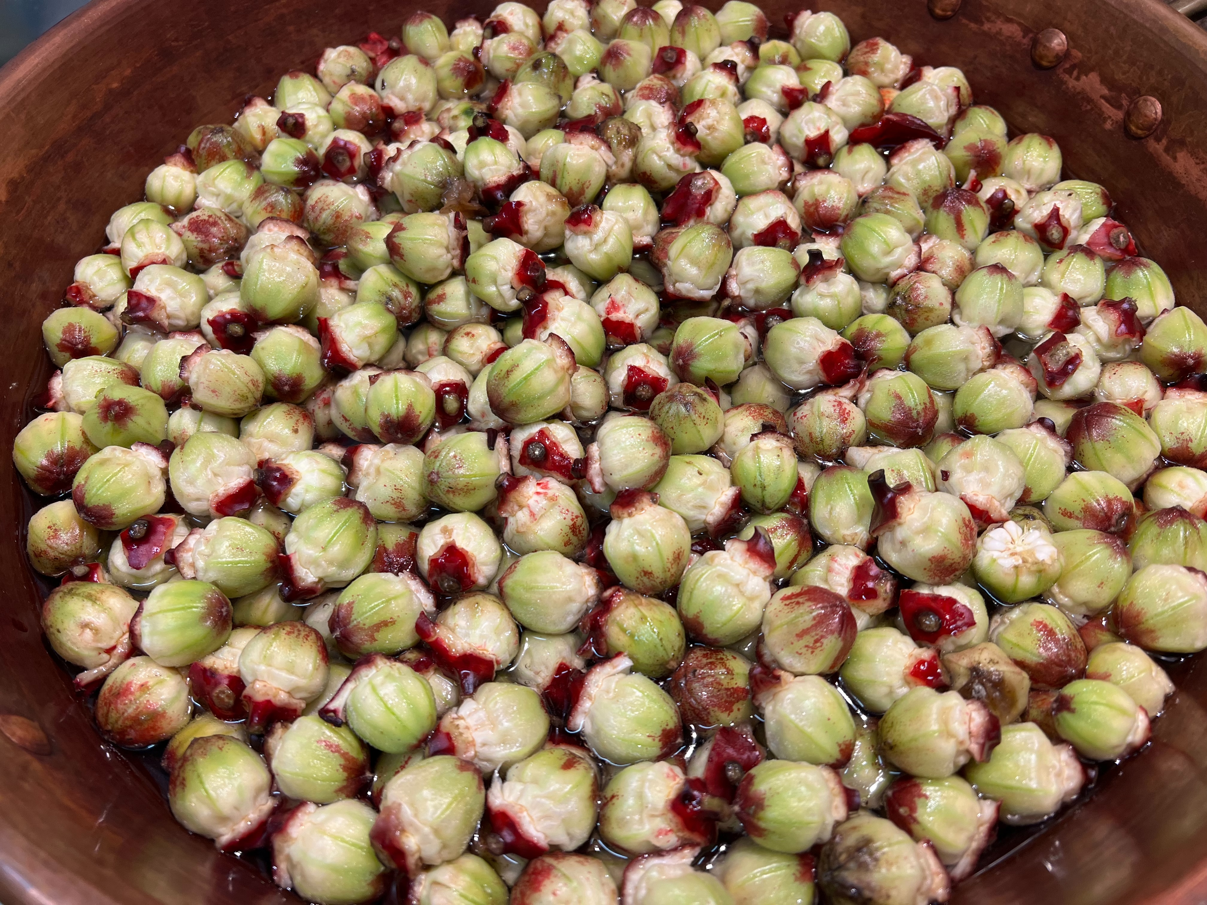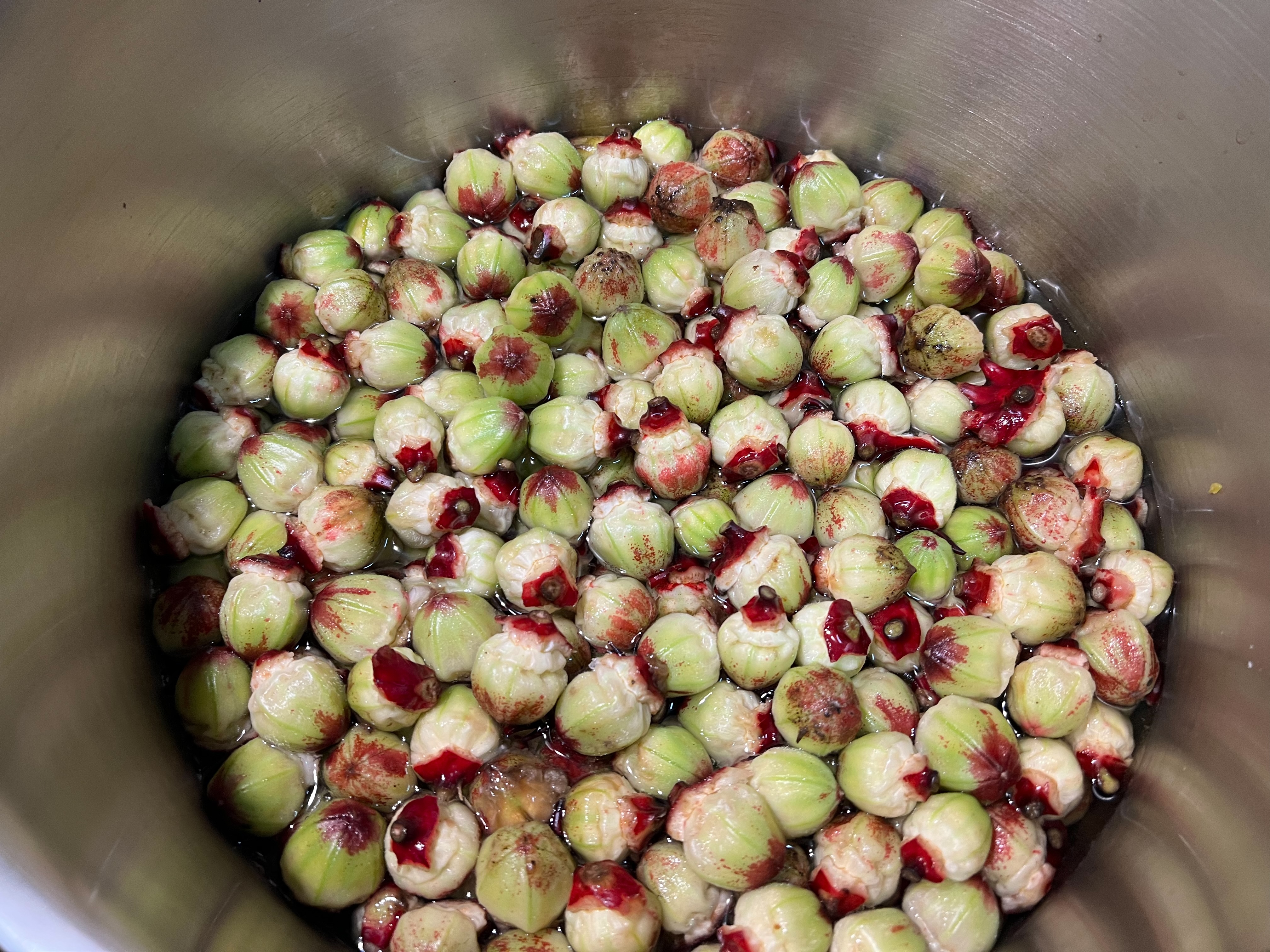 2.用銅鍋內果膠水煮洛神果肉;可將整個鍋盛滿果肉、很快熱氣上升果肉立即軟化、縮收釋放出水溶於果膠。