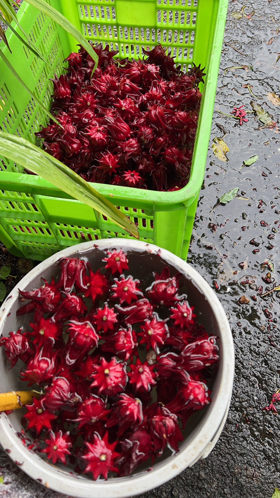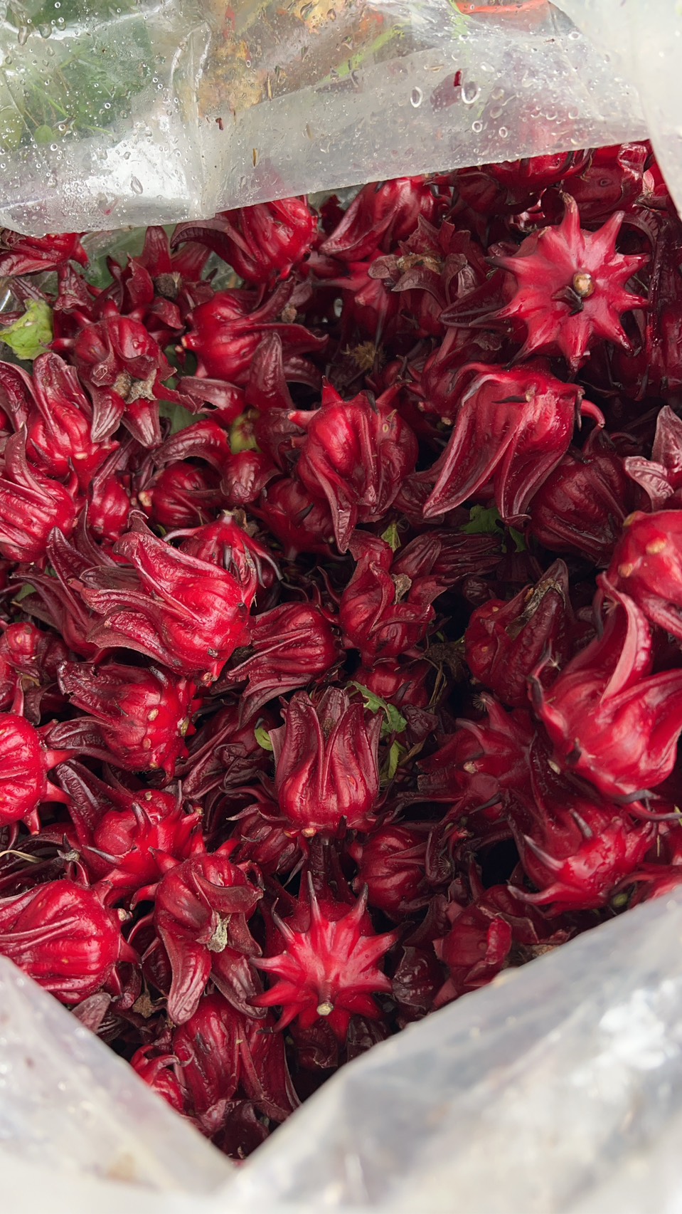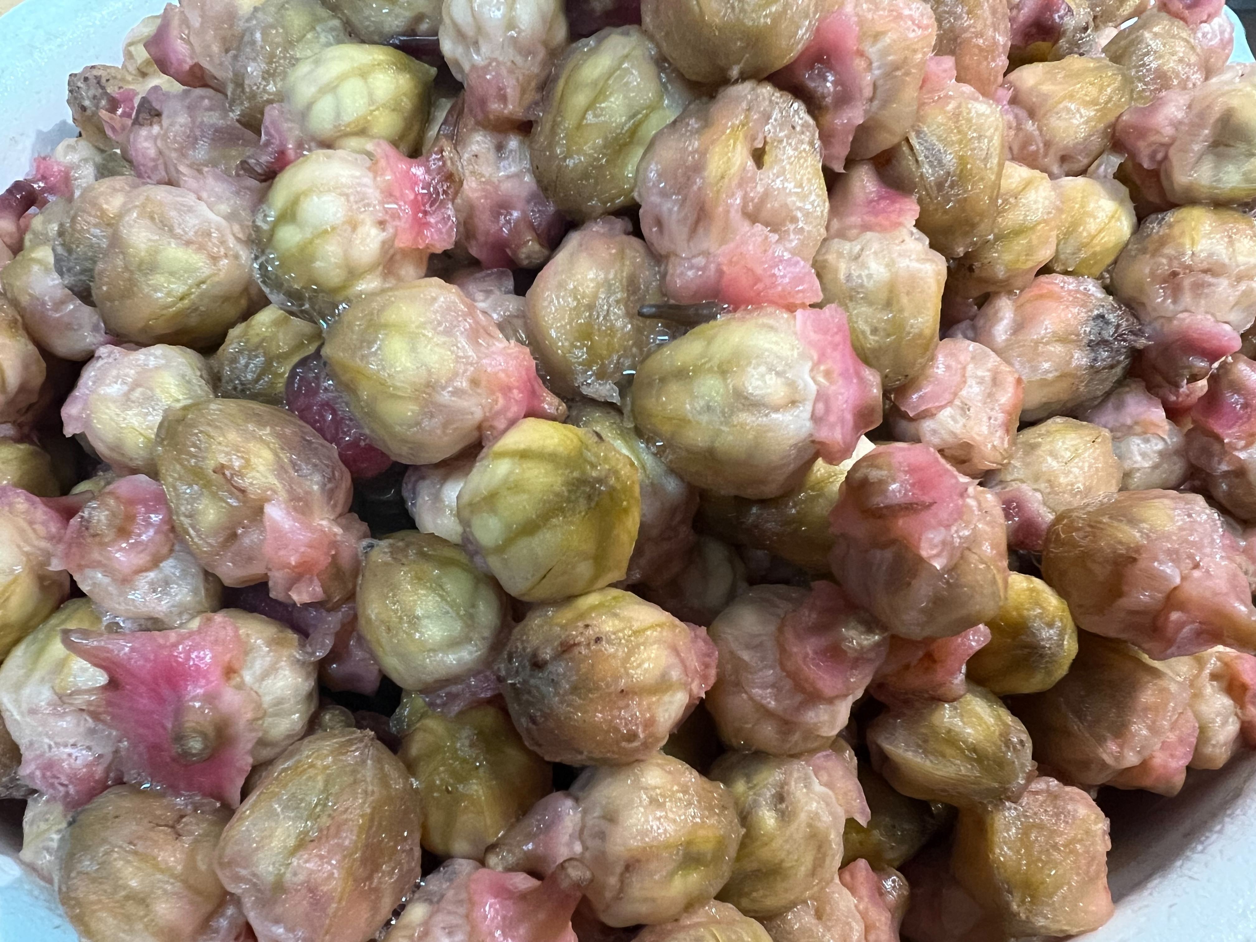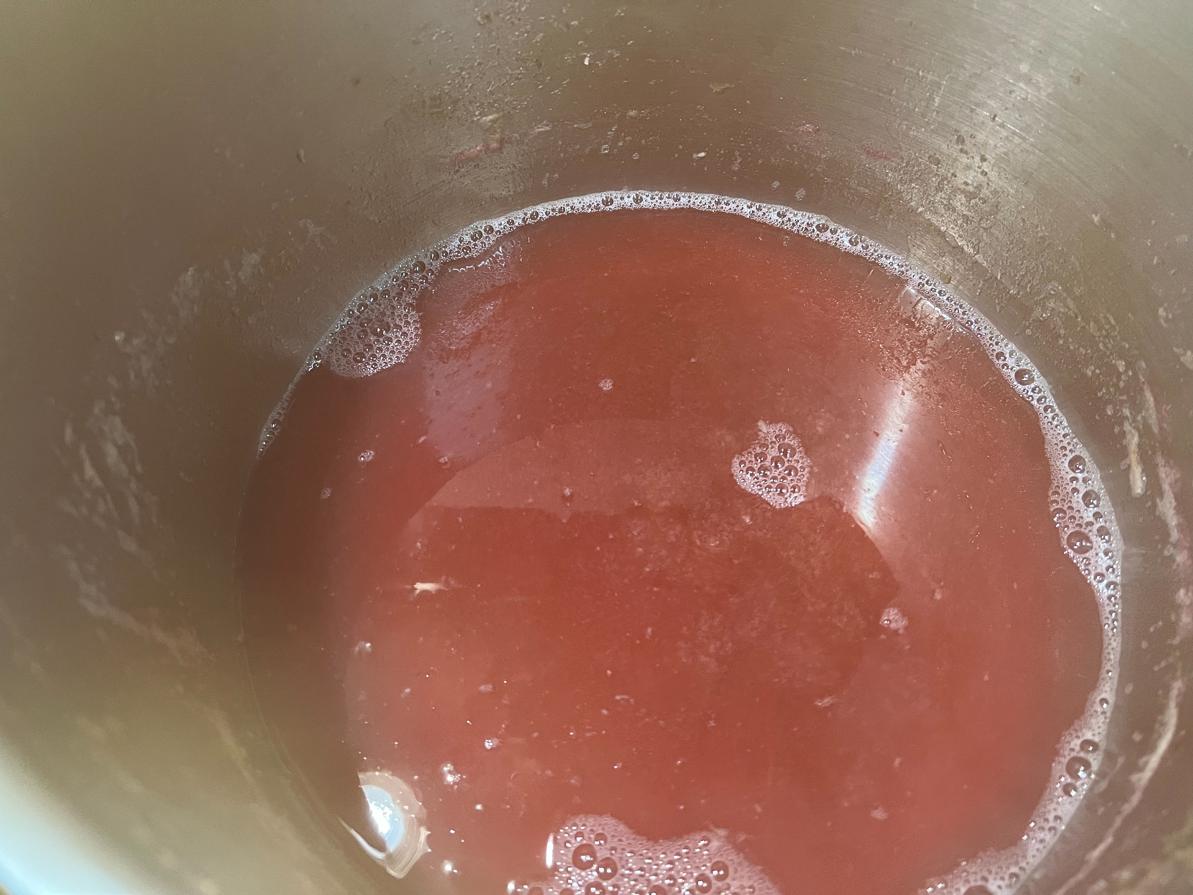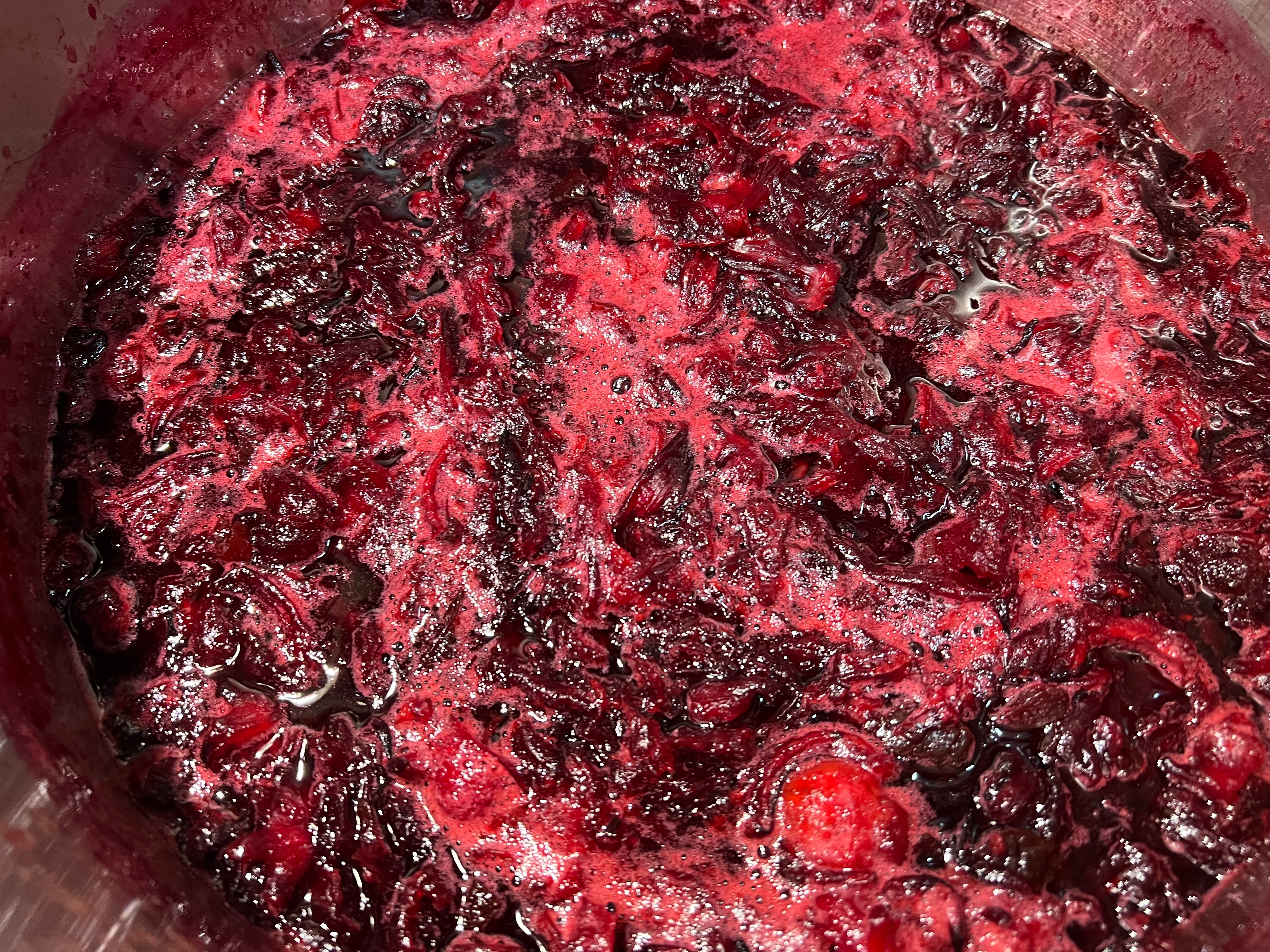 2.用銅鍋內果膠水煮洛神果肉;可將整個鍋盛滿果肉、很快熱氣上升果肉立即軟化、縮收釋放出水溶於果膠。